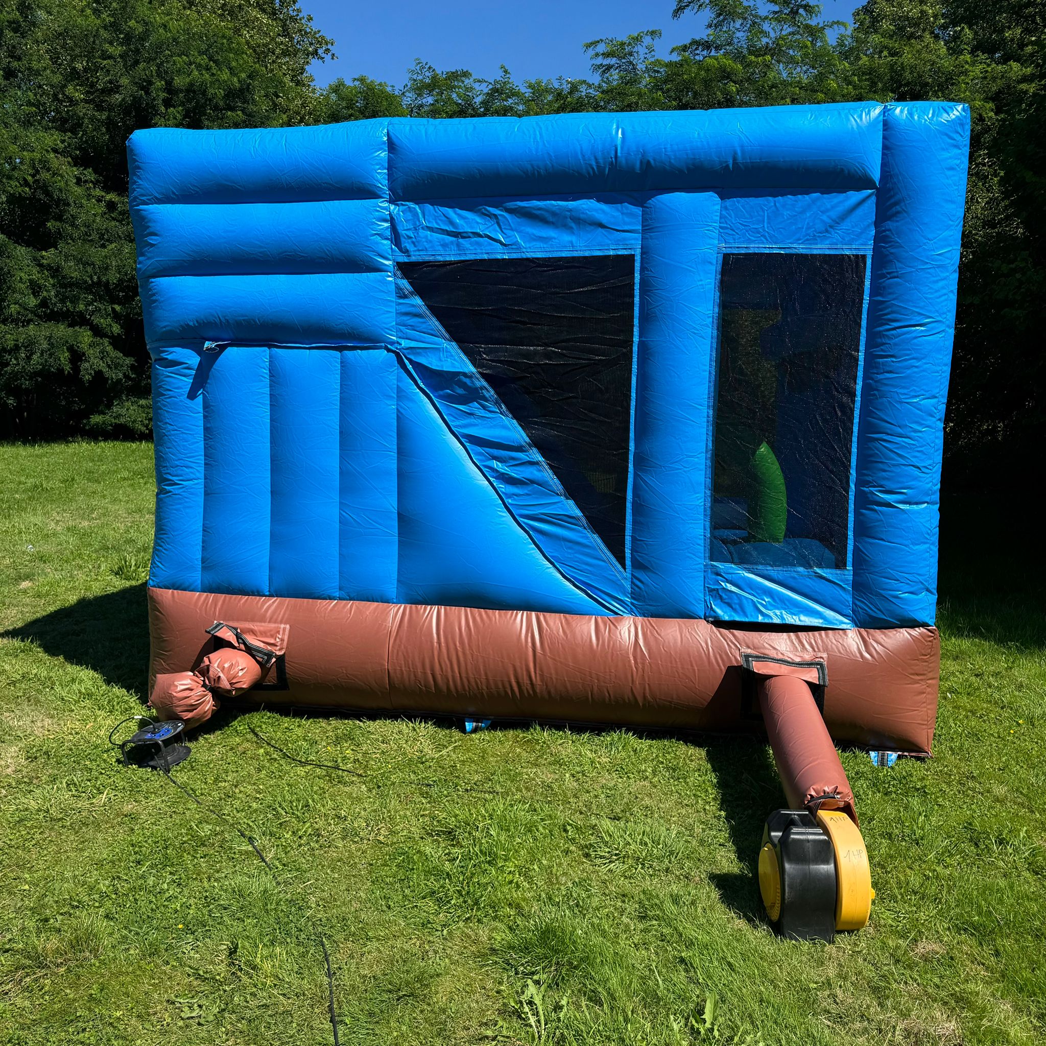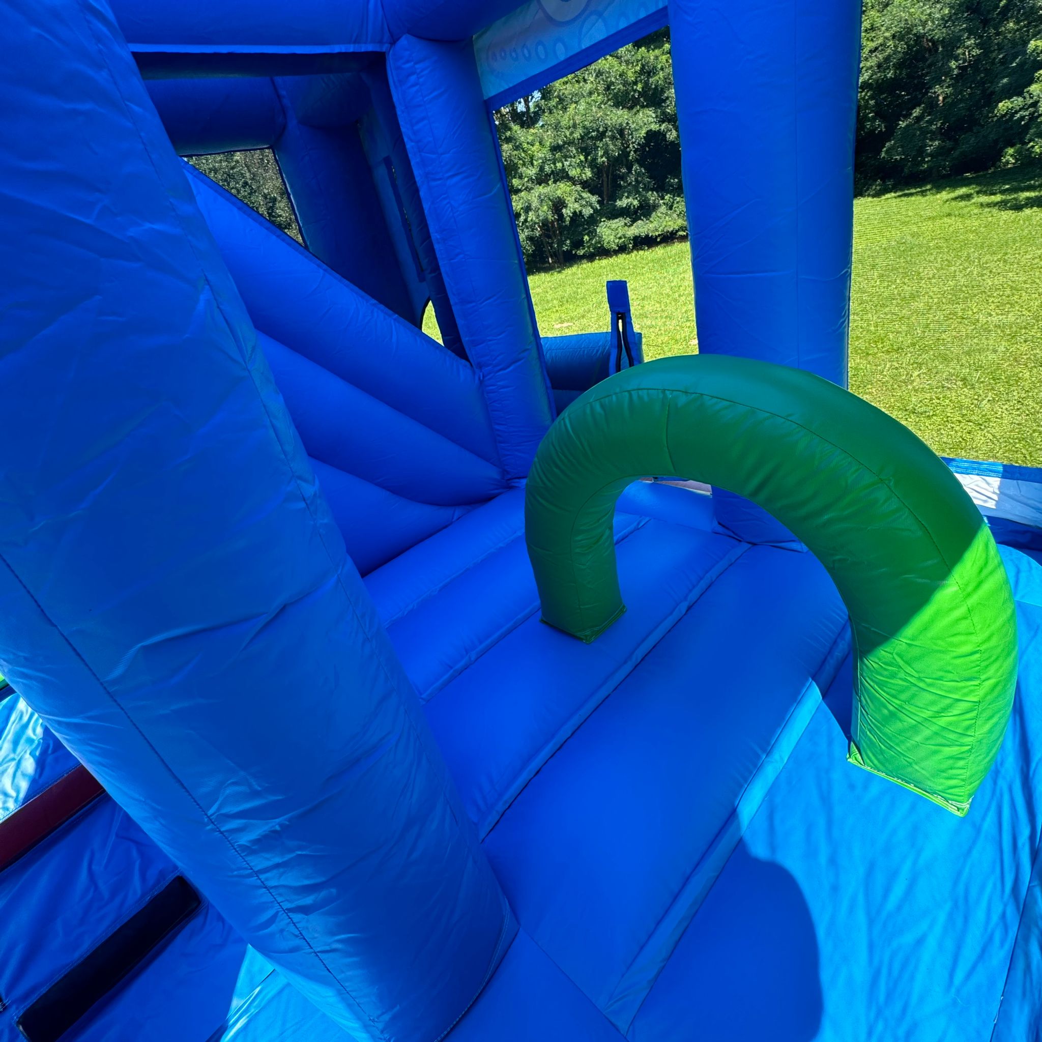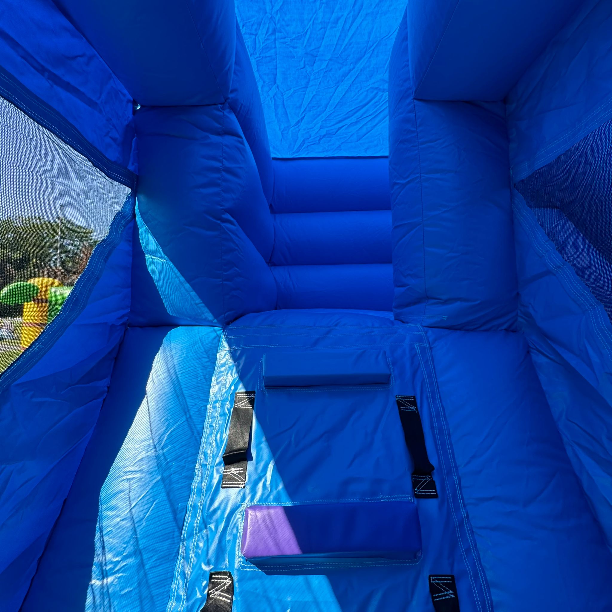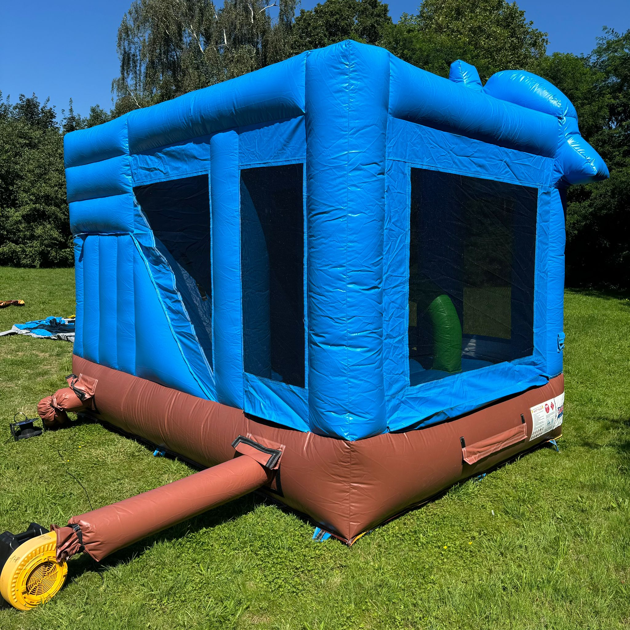L'entrée du château se fait par une petite fente sur la façade avant, équipée d'une fermeture éclair pour garantir la sécurité des enfants à l'intérieur. Un socle gonflable à l'entrée permet aux enfants de s’asseoir pour enlever leurs chaussures avant d’y entrer. Le château est équipé d'un demi-cerceau gonflable, d'un panier de basket suspendu et d'un toboggan.