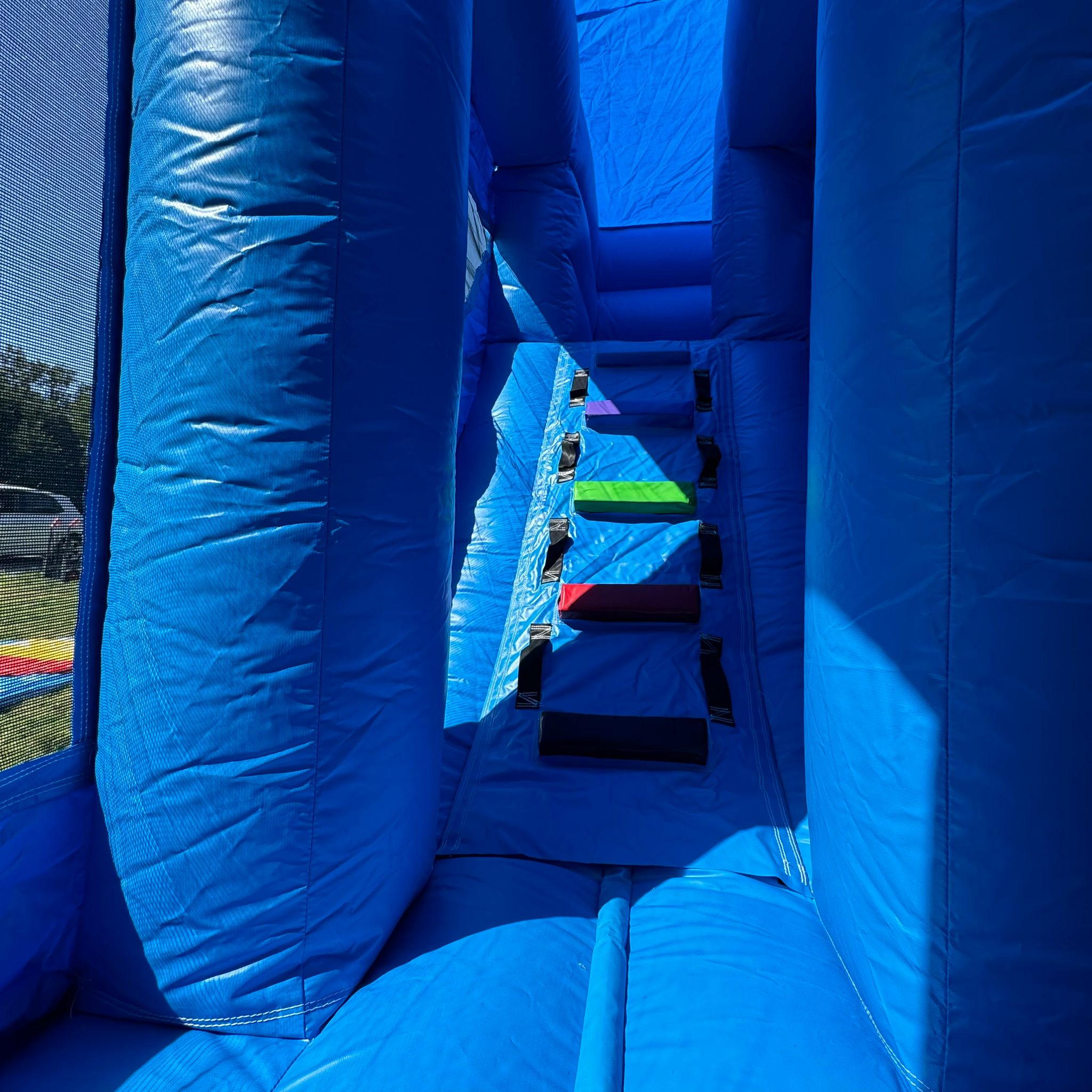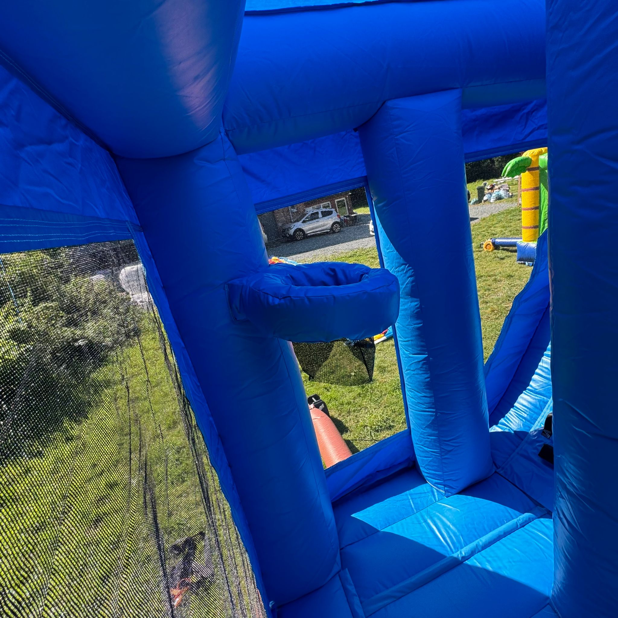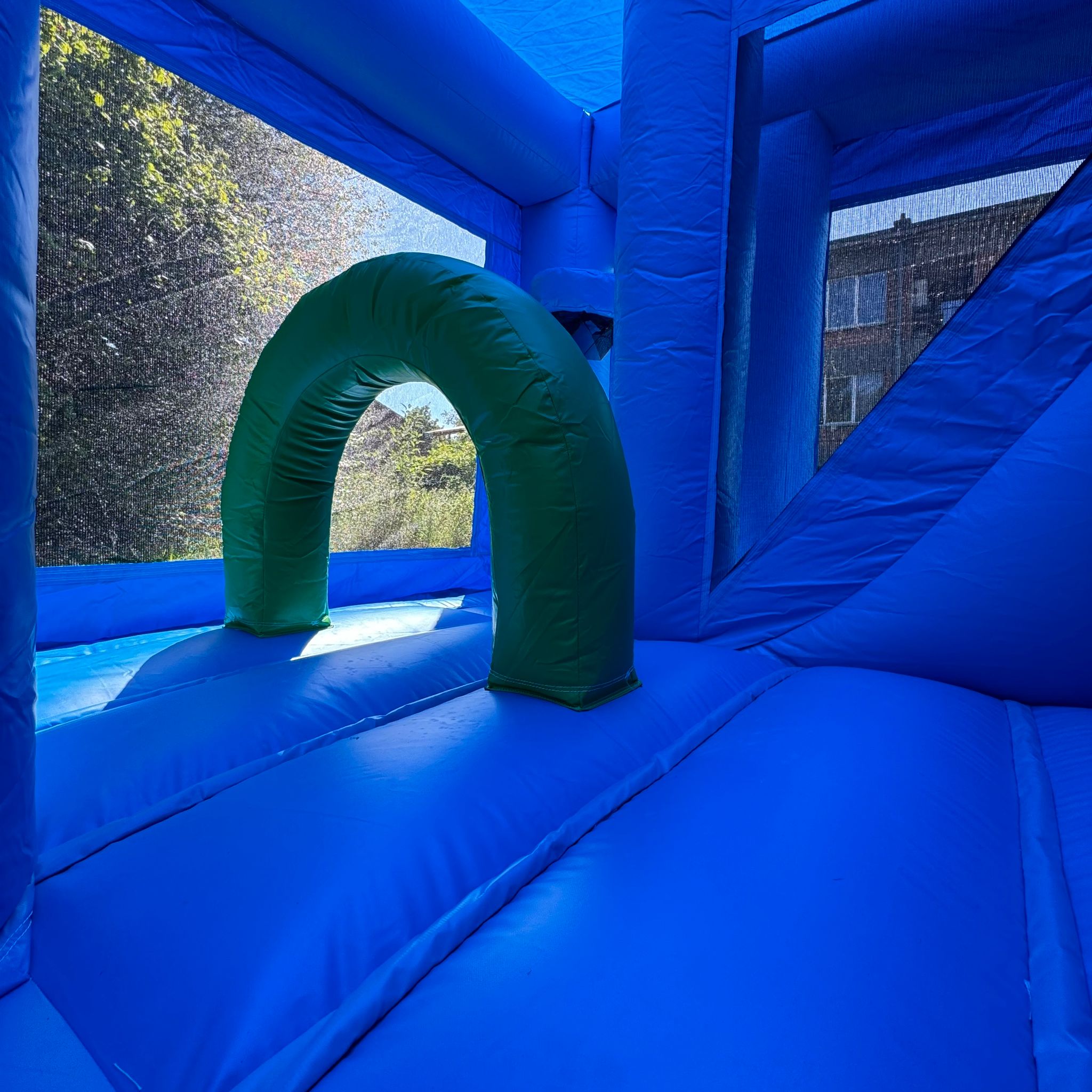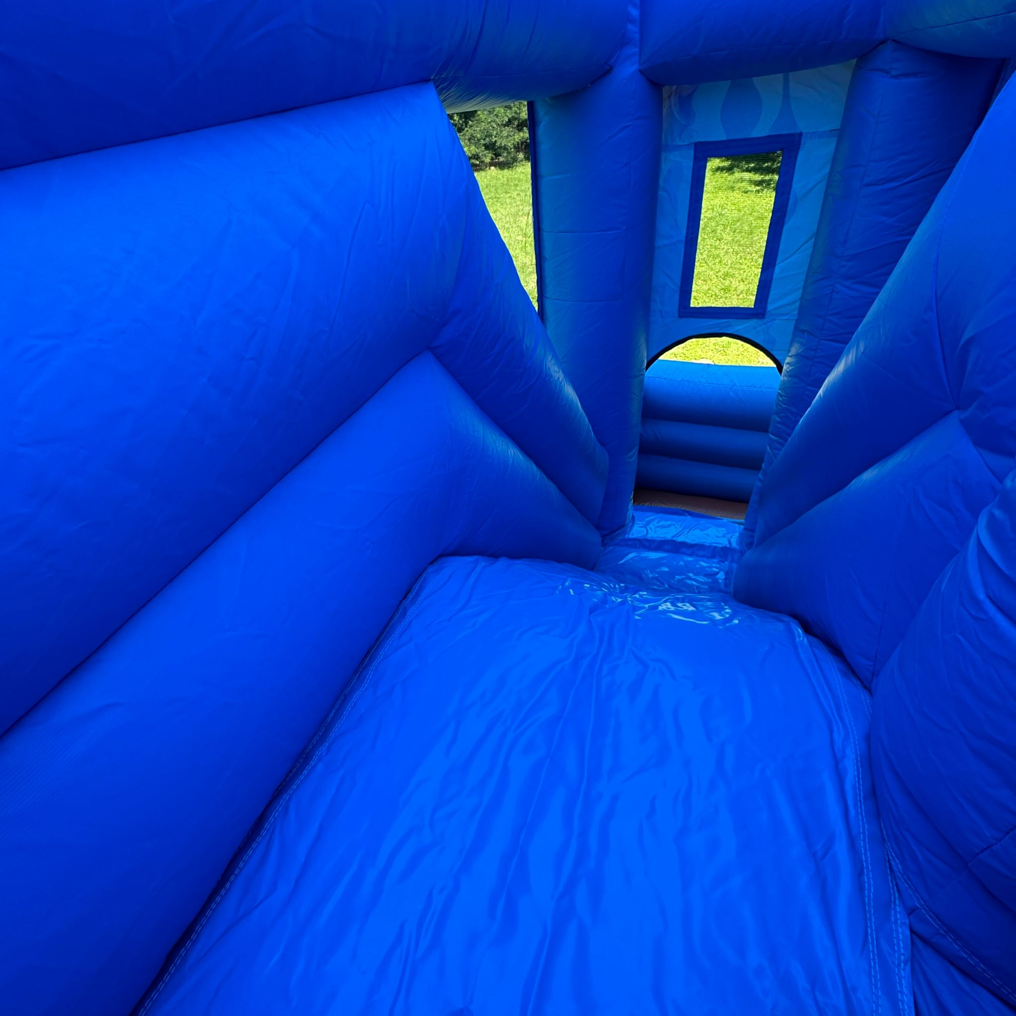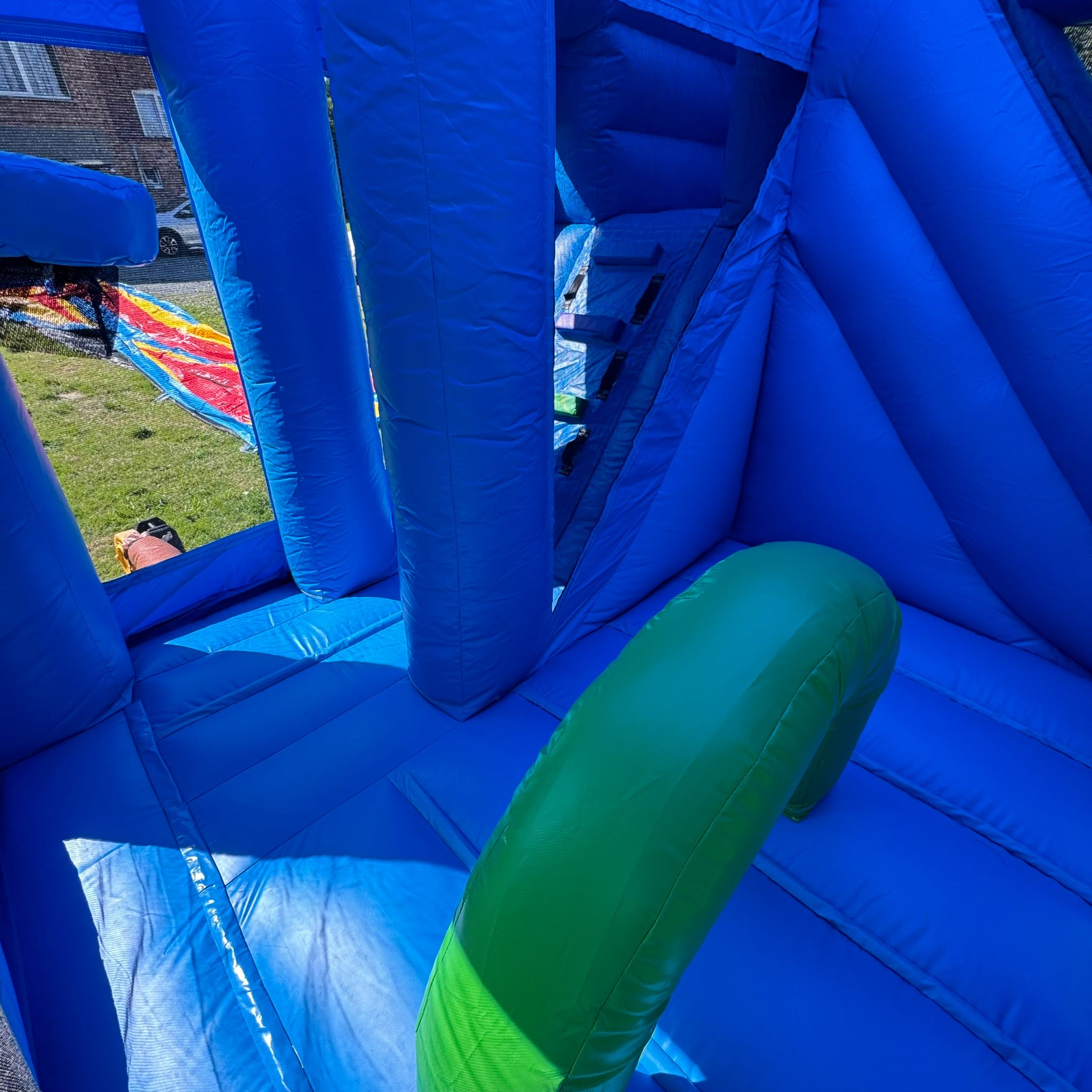 L'entrée du château se fait par une petite fente sur la façade avant, équipée d'une fermeture éclair pour garantir la sécurité des enfants à l'intérieur. Un socle gonflable à l'entrée permet aux enfants de s’asseoir pour enlever leurs chaussures avant d’y entrer. Le château est équipé d'un demi-cerceau gonflable, d'un panier de basket suspendu et d'un toboggan.