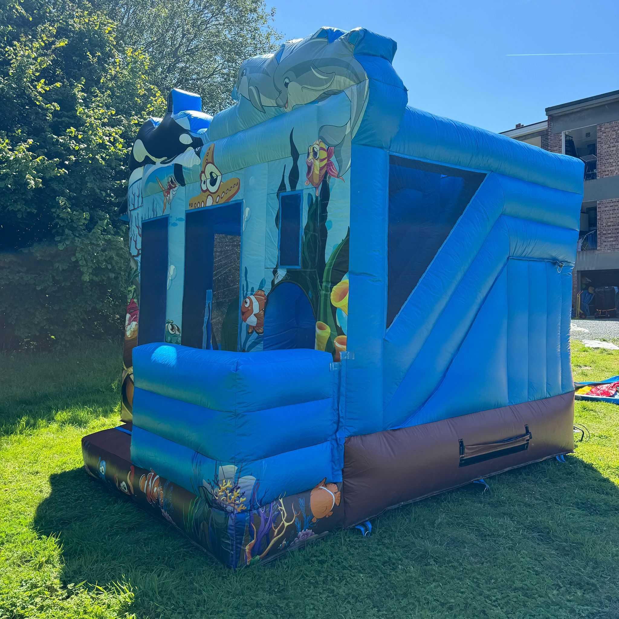 Le château gonflable « Le Némo » mesure 3,95 mètres de long, 3,95 mètres de large, et 3,1 mètres de haut. Il est orné de superbes illustrations représentant des personnages emblématiques du film « Le Monde de Némo », comme Némo, Marin, une étoile de mer comique, et même un grand orque et eds dauphins. Les couleurs dominantes sont le bleu océan, le brun et le vert, créant une atmosphère immersive pour les petits aventuriers.