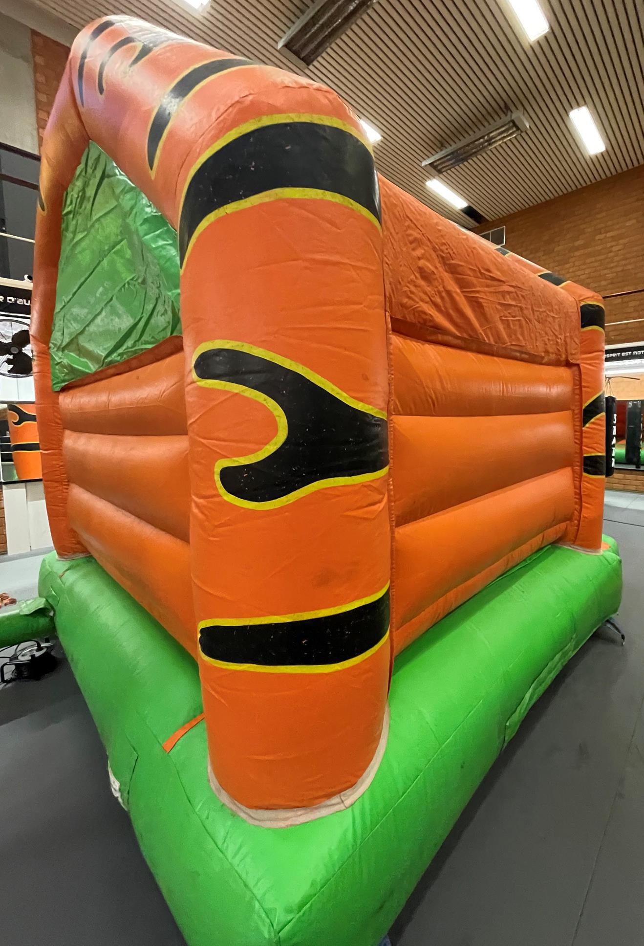"Le Tigre" is 4 metres long, 5 metres wide and reaches a height of 5 metres, providing a vast playground. Access is via a large inflatable platform that leads to a covered play area, protecting children from bad weather and UV rays. Inflatable walls, a guarantee of safety, frame this play area. The visual aspect of the castle is striking, with a dominant green and orange color scheme for the floor, orange walls, and a yellow background evoking the jungle. The entrance archway, decorated with tiger motifs and topped by an imposing tiger head, is an invitation to adventure.
